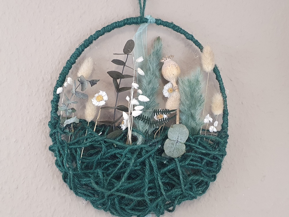 Der fertiggestellte Loop-Kranz, mit einem Durchmesser von circa 25-30 cm, wird zum stilvollen Highlight Ihrer Wohnraumdekoration. Er ist nicht nur ein dekoratives Element, sondern auch ein persönlicher Ausdruck Ihrer Kreativität und Ihres Einrichtungsstils.
